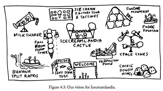 Did we say that this was a ctional example? Ahem...well, here’s an early concept map of what we envision for Icecreamlandia: