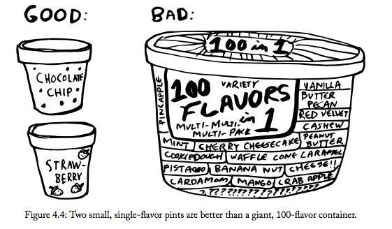 In essence, each app should be tightly focused on its task. If an app can’t be explained in a single sentence of moderate length, or you need to say ‘and’ more than once, it probably means the app is too big and should be broken up.